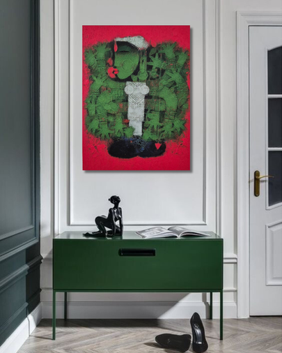 His oeuvre is rich and varied, ranging from free-associative, non-representational works to paintings featuring his signature slant-eyed, puppet-like figures. Drawing inspiration from Bengali tribal lore, folk traditions, the symbolism of Durga, the principle of Shakti, and Baul music, Basuki transforms everyday narratives into visual poetry. The earthy textures and patterns of Bishnupur’s terracotta temples echo in his mural-like canvases, where decorative motifs evolve into abstract, dynamic forms.