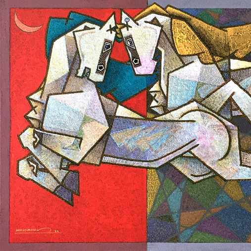 Over time, Jadhav's style has evolved from the intense passion and anguish of his earlier works to a more self-assured, romantic expression. This transition is evident in his "Lust for Love" series, where horses are depicted in pairs, embodying a carefree and adventurous spirit. The introduction of the bull into his portfolio adds a new dimension, representing strength and virility, charging toward dreams and desires.