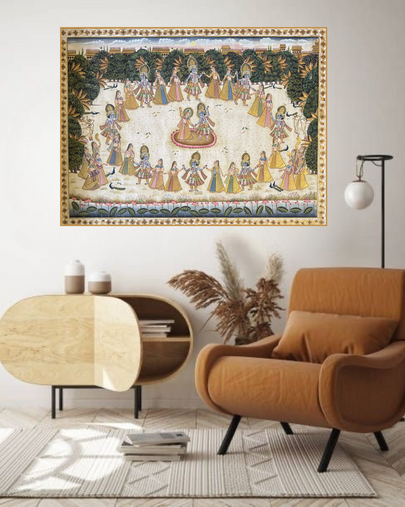 Pichwai, a traditional art form that emerged over 400 years ago in Nathdwara, Rajasthan, is known for its intricate and visually captivating depictions of Lord Krishna’s life. Painted on cloth, these artworks often illustrate Shrinathji, a form of Krishna as a seven-year-old child, along with Radha, gopis, cows, and lotuses. Pichwai paintings are deeply tied to festivals and celebrations such as Sharad Purnima, Raas Leela, Annakoot, Janmashtami, Gopashtami, Diwali, and Holi. The name Pichwai comes from the words pichh (back) and wai (textile hanging), as these paintings were originally designed to adorn the temple walls of Shrinathji in Nathdwara. Created by the artisans of the Pushti Marg sect, founded by Shri Vallabhacharya in the 16th century, these artworks served as seasonal backdrops for temple rituals, marking important events in Krishna’s life. Over time, their visual appeal and spiritual significance led to their presence in private collections and homes. A unique aspect of Pichwai art is its use of natural colors, derived from minerals, plants, flowers, and even gold and silver leaf. These pigments not only add richness and depth to the paintings but also ensure their longevity and sustainability. The vibrant blues, deep reds, and shimmering golds carry symbolic meanings, enhancing the spiritual and aesthetic essence of each piece. Over time, Pichwai paintings have found a place in the homes of art connoisseurs, appreciated for their intricate artistry and spiritual significance. However, like several other traditional Indian art forms, Pichwai is at risk of fading into obscurity and requires recognition and revival to preserve its rich heritage.
