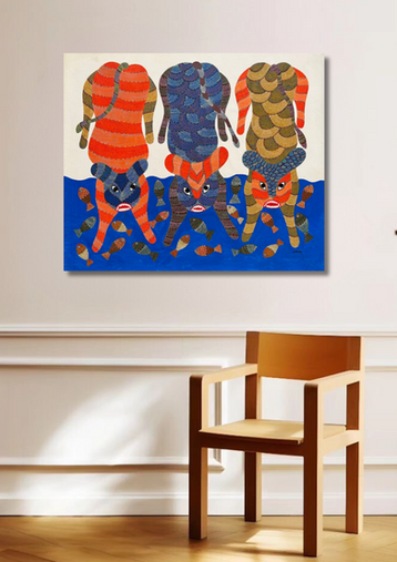 The Gond people, one of India's largest and most ancient tribes, have a 1400-year history. They primarily reside in Madhya Pradesh, Andhra Pradesh, Chhattisgarh, and Odisha, but their art is widely cherished by culture enthusiasts around the world. Gond art is deeply rooted in the belief that good images bring good luck. To ward off evil and invite good fortune, Gonds adorn their homes with traditional tattoos and motifs. Their paintings showcase their interconnectedness with nature, illustrating their beliefs, rituals, village life, and man's relationship with the natural world. In keeping with tradition, these artworks make generous use of vibrant hues, imaginative lines, and dots and often involve the application of materials found in nature, such as soil, plants, and charcoal. Today, Gond artists also incorporate modern materials such as canvas and acrylic and oil paints.