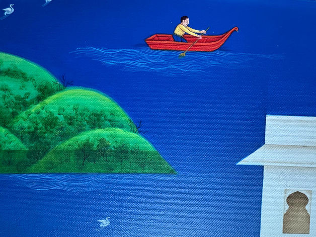 His work is deeply inspired by the architectural grandeur of Rajasthan—its palaces, temples, and vibrant cityscapes—alongside spiritual and scriptural imagery, which he reinterprets through a contemporary lens. Expansive in scale, his compositions employ multiple perspectives and a diverse range of mediums, from watercolor and oil to tempera, creating a dynamic visual experience.