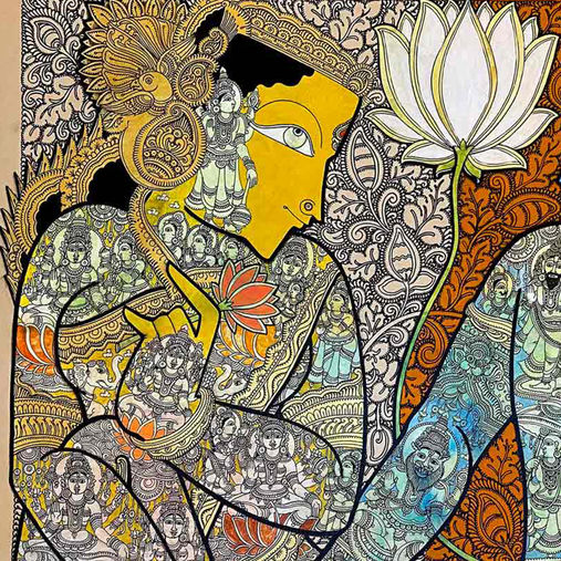 Ramesh Gorjala’s paintings remind us of the intertextuality of Indian myths, multiple stories within a tale, many images ensconced within one. Born in 1979, in Kalahasti, Andhra Pradesh to a family of weavers, Ramesh Gorjala learnt the traditional Kalamkari art as a child from his uncle, Balaji Theertham, a national award winning Kalamkari artist. Gorjala’s art reflects the early impressions of being in the midst of an art practiced for generations in his village, where there is a depiction of the mythological characters and stories on textile parchments as well as walls and scrolls. The hues and colors that we find in Gorjala’s paintings is also a testimony to this early influence: earthy reds and greens interspersed with washed browns and sandalwood shades, the combinations are inspired from the Kalamkari traditions. Gorjala left his training in commerce midway to pursue art, receiving his BFA and MFA degrees in Painting from JNTU, Hyderabad. It is here that Gorjala moves from the use of vegetable dyes to using acrylic as a medium. Post his BFA days, he traveled to Delhi and Bombay, to soak in the art of veterans and also proceeded to train under artists like Fawad Tamkanath and Laxman Aaley. Ramesh Gorjala has on multiple occasions expressed his deep gratitude for the creative guidance of artists like Thotta Vaikuntam and Surya Prakash. Gorjala’s remarkable body of work has won him many awards, including the 2000 Mahatma Gandhi Birth Centenary Memorial Award from the Victoria Technical Institute (V.T.I.), Chennai, and the 2002 State Award from the A.P. Crafts Council.   Ramesh Gorjala was inspired by the figures of Indian epics and one can trace his use of recurring mythic figures in his artlike Vishnu, Krishna, Hanuman and Kamadhenu among others. But his depictions of these epic figures are unique in the dense depiction of multiple narratives, figures and texts within the main icon. In his own words “The beauty of mythology lies in telling a story in a way that engages people. I was fascinated with drawing Hanuman and Krishna. When I began, I realized that many artists have drawn Gods and Goddesses earlier. So I started incorporating innumerable figures within the outlines of Hanuman or Krishna and thus narrating different stories.” The folk is also interwoven into the contemporary in his acrylic works on canvas and handmade paper. Having a huge appeal among the art lovers, Ramesh Gorjala’s art is well sought out for its South Asian ethos. His collectors include many including Beyonce and Narendra Modi, who requested him for a depiction of Kamadhenu, the symbol of wealth, joy and luck in Gorjala’s signature style. Gorjala has also now expanded his expertise to wooden carvings and wooden relief sculptures as well. While Gorjala is a frequent visitor to Hyderabad, he prefers the tranquility of Tirupati for his creative endeavors and currently works from this temple town.